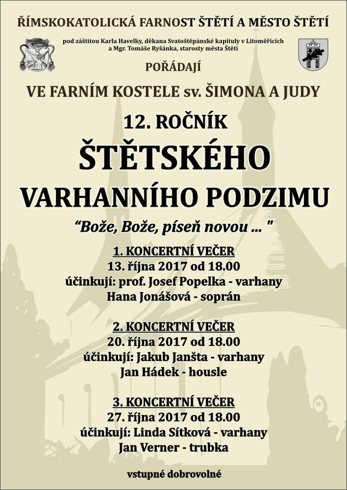 Dovolujeme si vás pozvat na 12. ročník Varhanního podzimu ve Štětí. Jako již tradičně se koncerty uskuteční ve farním kostele sv. Šimona a Judy vždy v pátek od 18:00 hod.