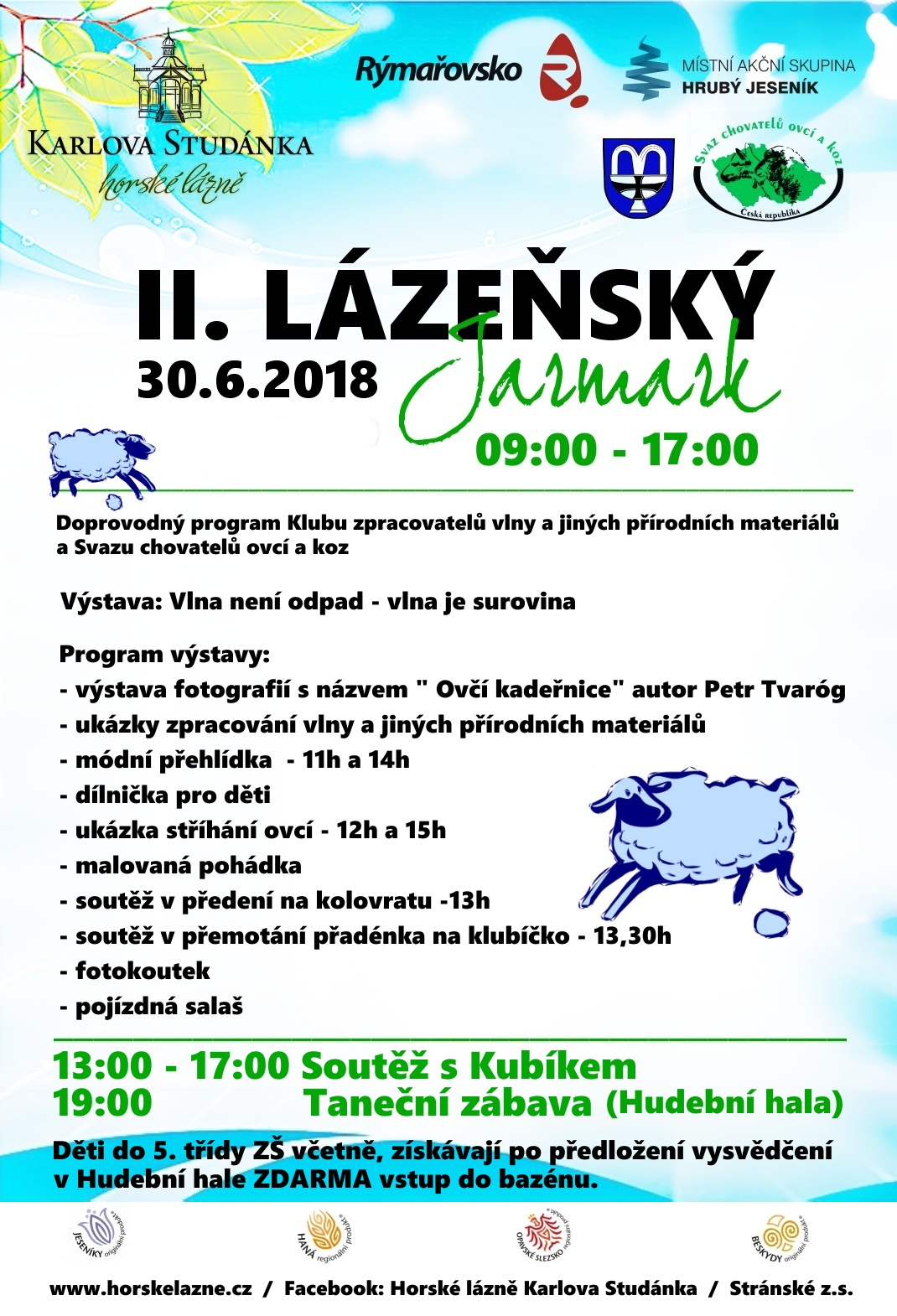 Horské lázně Karlova Studánka Vás srdečně zvou na již druhý Lázeňský jarmark. Je pro Vás připraven zajímavý doprovodný program zaměřený na zpracování ovčí vlny a jiných přírodních materiálů. Pro školáky máme připravený velmi milý bonus - školáci do 5. třídy ZŠ, kteří přinesou svá vysvědčení, získávají ZDARMA vstup do bazénu.